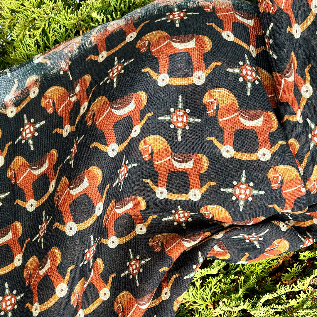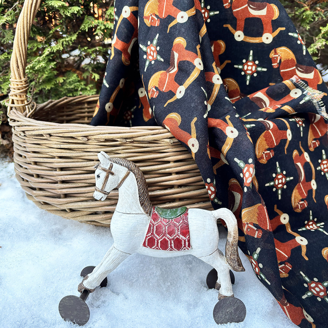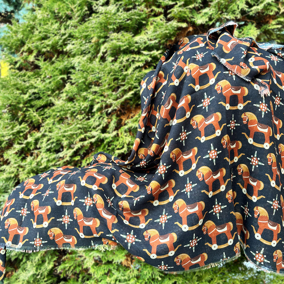 Шаль из тонкой натуральной шерсти. Авторский принт из серии ЛОШАДКИ, бахрома по краю.