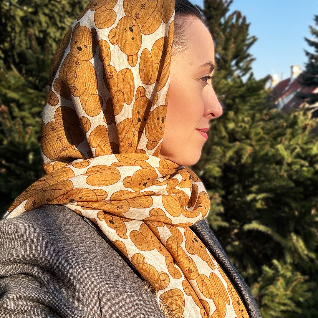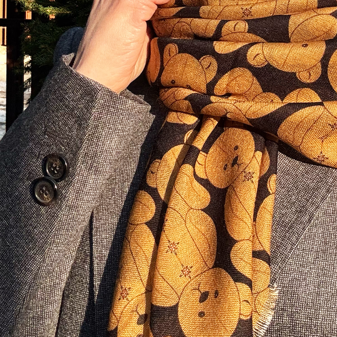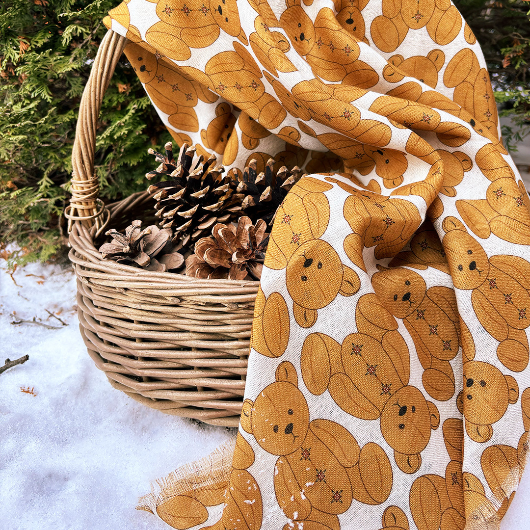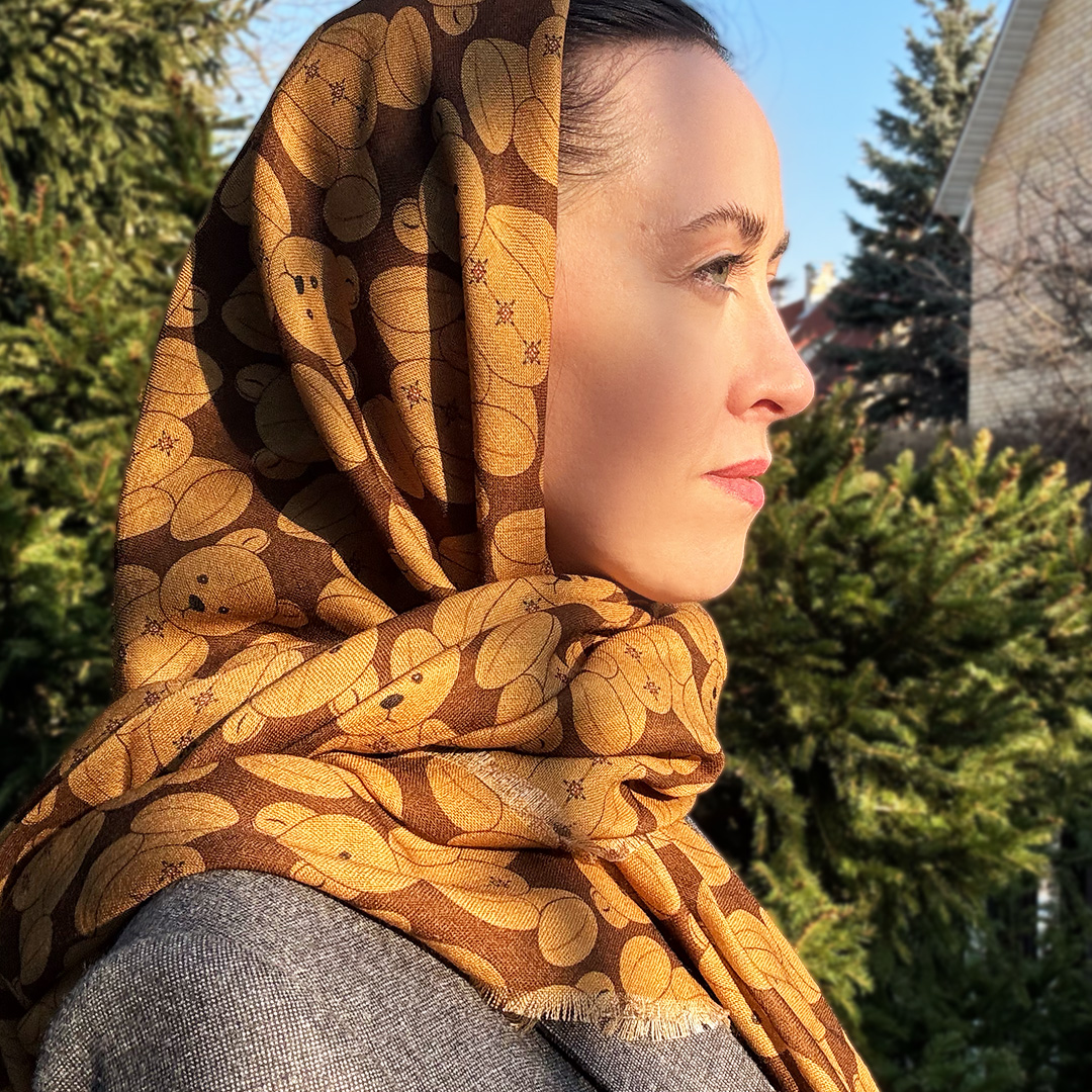 Шаль из тонкой натуральной шерсти. Авторский принт из серии ТЭДДИ, бахрома по краю.